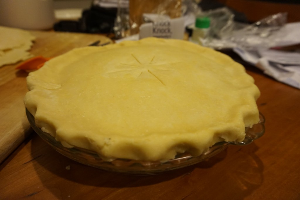 Now might be a good time to preheat the oven to 350 F. Cut the dough roughly in half (maybe one half slightly larger, like ⅝ of the dough) and roll each piece out into a nice circle ¼ inch thick. The thinner the better as long as the butter isn’t melting or the dough breaking. Wrap the larger crust around the rolling pin to transport the crust into the pie tin. Trim the edges.